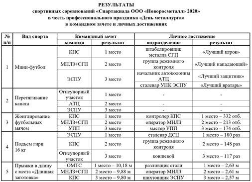 27 июня 2020 года были проведены спортивные состязания между структурными подразделениями ООО «Новоросметалл» и ООО «НКЗ», приуроченные к профессиональному празднику «День металлурга».